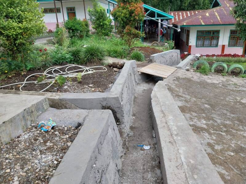PROJECTPLAN : AANSLUITEN WATERAFVOER DAK EETZAAL OP BESTAANDE GOOT, zodat er minder wateroverlast is. Ruteng is een bergstad en het regent daar vaak.